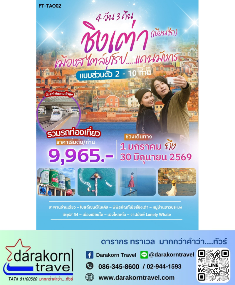 | DAY4 | นั่งรถไฟความเร็วสูงชั้น 2 ไปชิงเต่า – ส่งสนามบิน/ สถานีรถไฟ เมืองชิงเต่า |