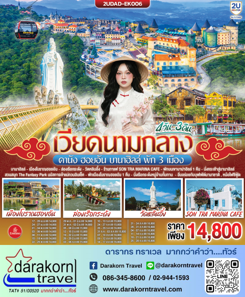 | DAY1 | กรุงเทพฯ (ท่าอากาศยานสุวรรณภูมิ) – ดานัง(ท่าอากาศยานนานาชาติดานัง) EK370 : 20:10 – 21:50) – เมืองดานัง |