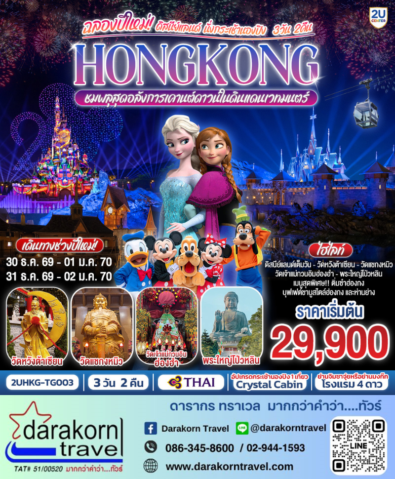 | ทัวร์ฮ่องกง – HONGKONG ดิสนีย์แลนด์ นั่งกระเช้านองปิง ฉลองปีใหม่ ชมพลุสุดอลังการเคานต์ดาวน์ในดินแดนเวทมนตร์ 3วัน2คืน(TG)เดือนธันวาคม 2569 |