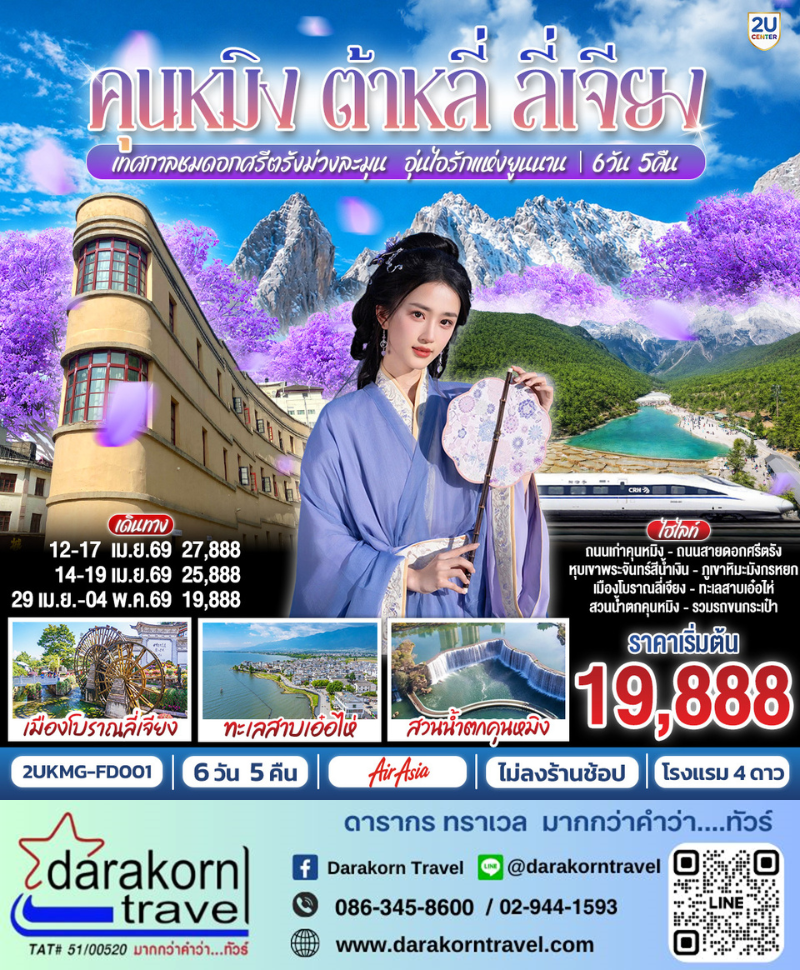 | DAY1 | กรุงเทพฯ (สนามบินดอนเมือง) – คุนหมิง (ท่าอากาศยานนานาชาติคุนหมิงฉางสุ่ย) (FD582 : 09:15 – 12:30) – เมืองต้าหลี่ |