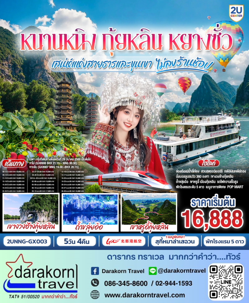 | DAY1 | กรุงเทพฯ(สนามบินสุวรรณภูมิ) – สนามบินหนานหนิง (GX8910 BKK10.45 – NNG 13.55) – รถไฟความเร็วสูงสู่เมืองกุ้ยหลิน***เฉพาะกรุ๊ปที่เดินทางตั้งแต่วันที่29 มี.ค. 2569 เป็นต้นไป เปลี่ยนเป็นไฟล์ท (GX8908 BKK 21.15 – NNG 00.30) |