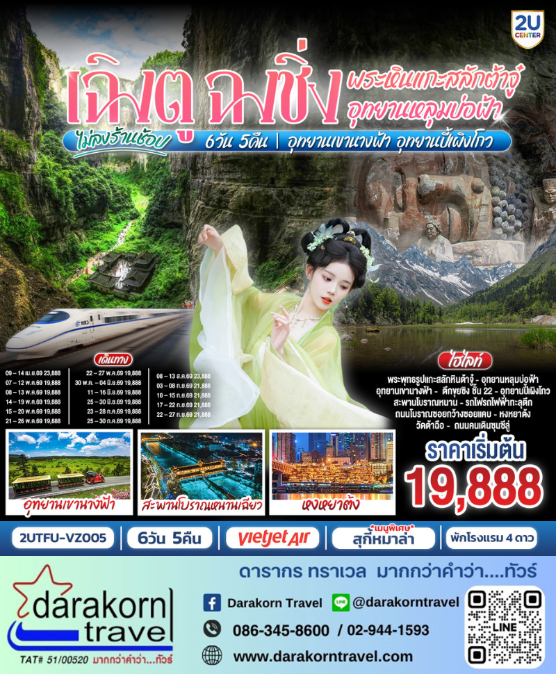 ทัวร์จีน – เฉิงตู ฉงชิ่ง มรดกโลกพระหินแกะสลักต้าจู๋ อุทยานหลุมบ่อฟ้า อุทยานเขานางฟ้า อุทยานปี้เผิงโกว(นั่งรถไฟความเร็วสูง) 6วัน5คืน(VZ)เดือนเมษายน – กันยายน 2569