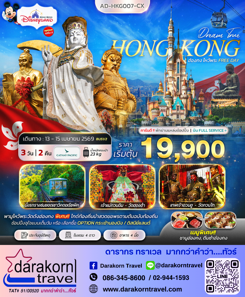 ทัวร์ฮ่องกง - ฮ่องกง ไหว้พระ FREE DAY 3วัน2คืน(CX)เดือนเมษายน 2569