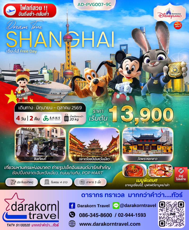 | DAY3 | FREE DAY อิสระช้อปปิ้งเต็มวัน หรือเลือกซื้อ OPTION OPTION : สวนสนุก SHANGHAI DISNEYLAND (เดินทาง 5 ท่านขึ้นไป มีรถรับ-ส่ง) |
