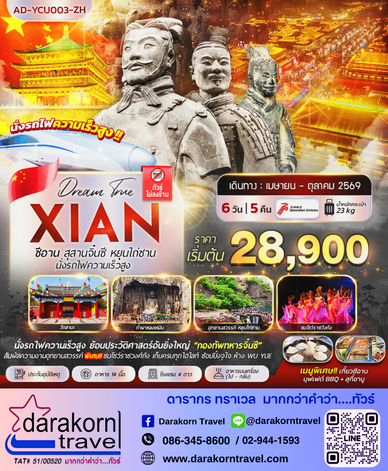 | DAY2 | เมืองหยุนเฉิง – สุสานทหารจิ๋นซี(รวมรถแบตเตอรี่) – จัตุรัสหอกลอง-หอระฆัง – เจดีย์ห่านป่าใหญ่(ไม่ขึ้น เจดีย์) – ถนนคนเดินวัฒธรรมถัง – POP MART – ชมโชว์ราชวงศ์ถัง |