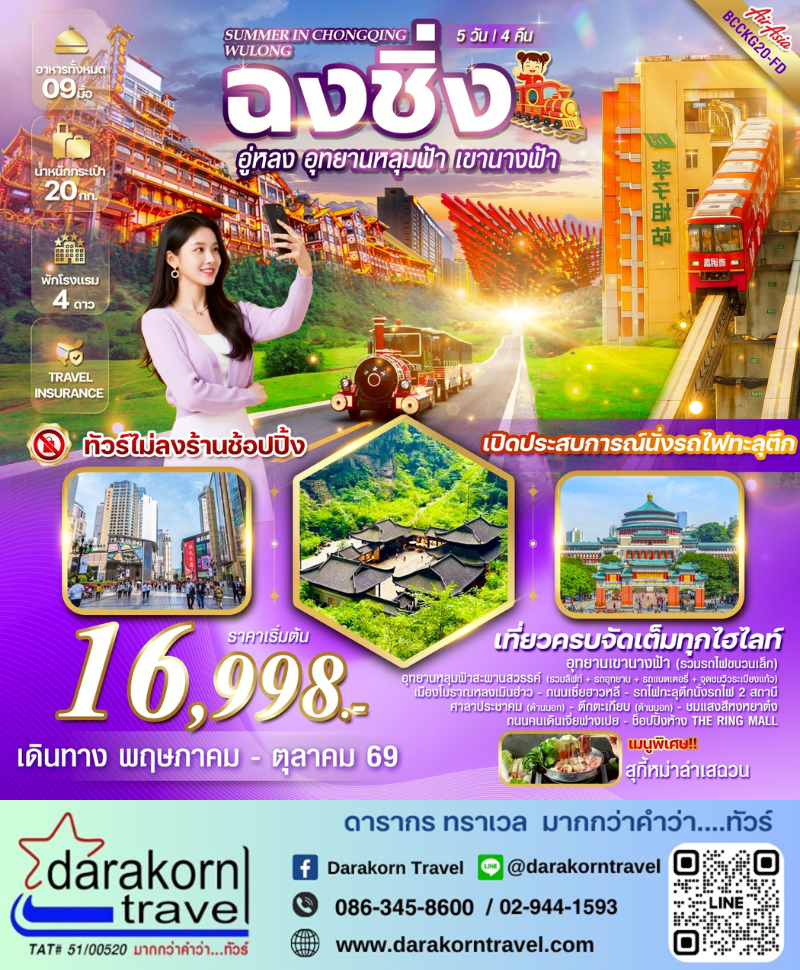 | DAY5 | ฉงชิ่ง– วัดเจ้าแม่กวนอิม – ห้าง THE RING MALL – สนามบินฉงชิ่งเจียงเป่า – ท่าอากาศยานดอนเมือง (FD553 18.55-21.05) |