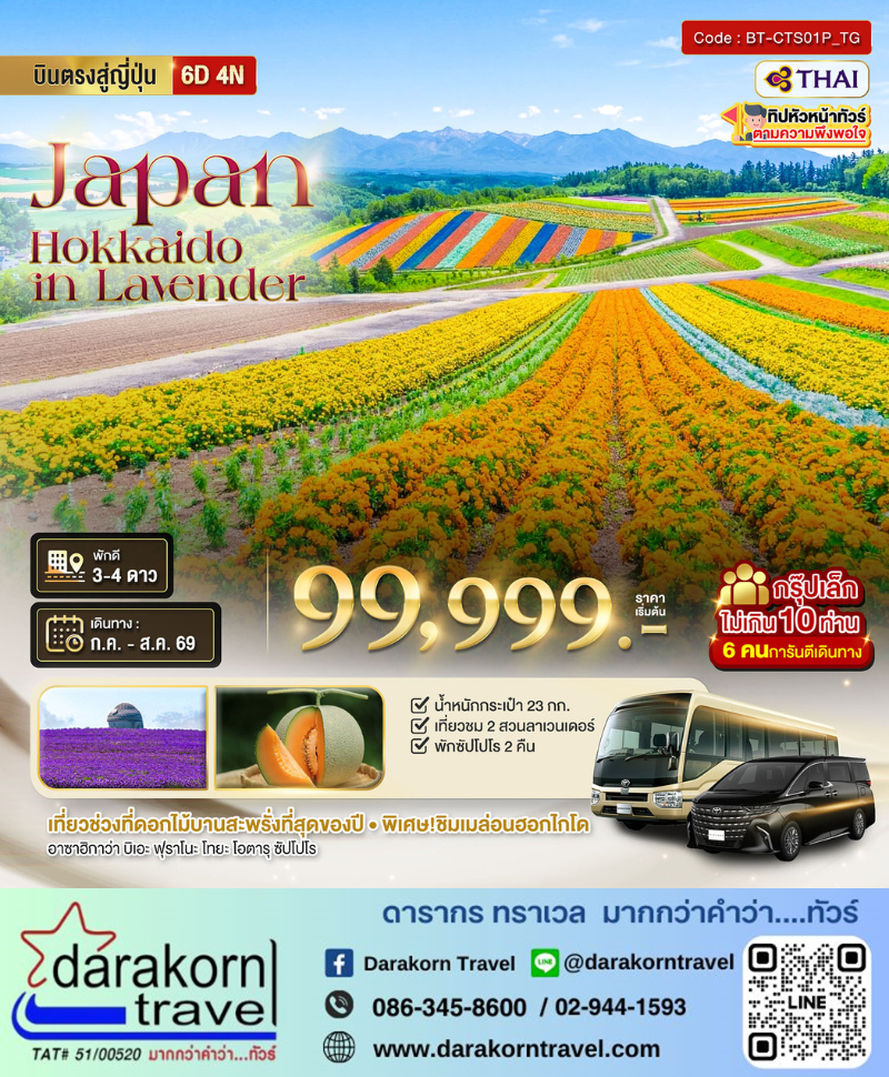 | DAY1 | กรุงเทพฯ (สนามบินสุวรรณภูมิ) – ซัปโปโร (สนามบินชิโตเซะ) (TG670 : 23.45-08.30) |