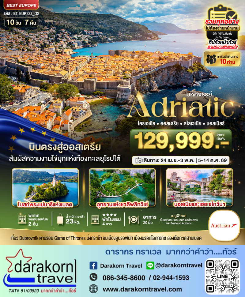 | ทัวร์ยุโรป – มหัศจรรย์…เอเดรียติก โครเอเชีย ออสเตรีย สโลวีเนีย บอสเนีย 10วัน7คืน(OS)เดือนพฤษภาคม – ตุลาคม 2569 |