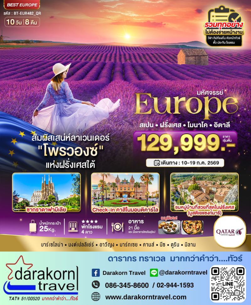 ทัวร์ยุโรป - มหัศจรรย์...ยุโรป สเปน ฝรั่งเศส โมนาโค อิตาลี (ลาเวนเดอร์โพรวองซ์) 10วัน7คืน(QR)เดือนกรกฎาคม 2569