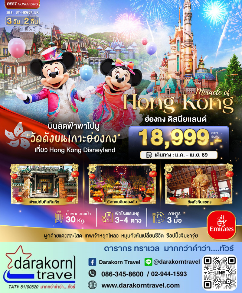 ทัวร์ฮ่องกง – มหัศจรรย์…ฮ่องกง ดิสนีย์แลนด์ 3วัน2คืน(EK)เดือนมกราคม – เมษายน 2569