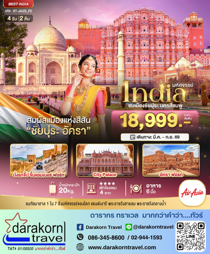 ทัวร์อินเดีย - มหัศจรรย์...INDIA เที่ยวชม 2 เมือง ชัยปุระ อัครา 4วัน2คืน(FD)เดือนมีนาคม - กันยายน 2569