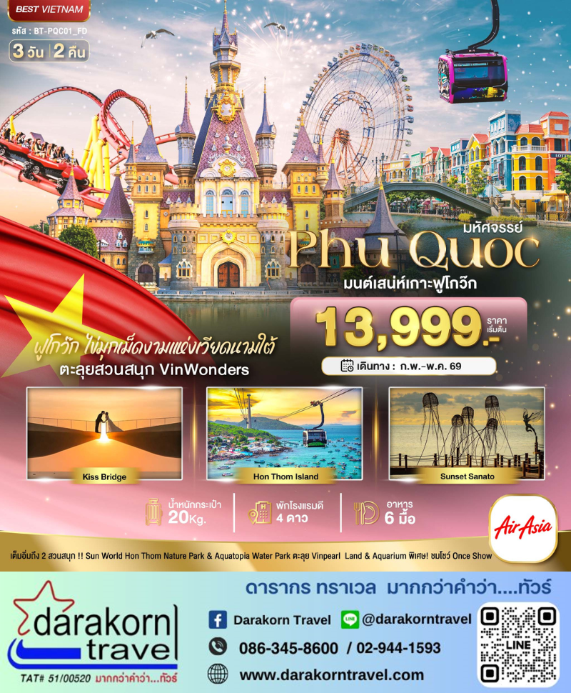 | DAY1 | ดอนเมือง กรุงเทพฯ – สนามบินฟู้โกว๊ก – นั่งกระเช้าเข้าสู่เกาะ Hon Thom Nature Park – สวนสนุกซันเวิร์ลรัรอบคัม – สวนป่้องกวางไทเปย – ซันเซ็ตกาวน์ – สะพานบุบ – ตลาดไนท์มาร์เก็ต |