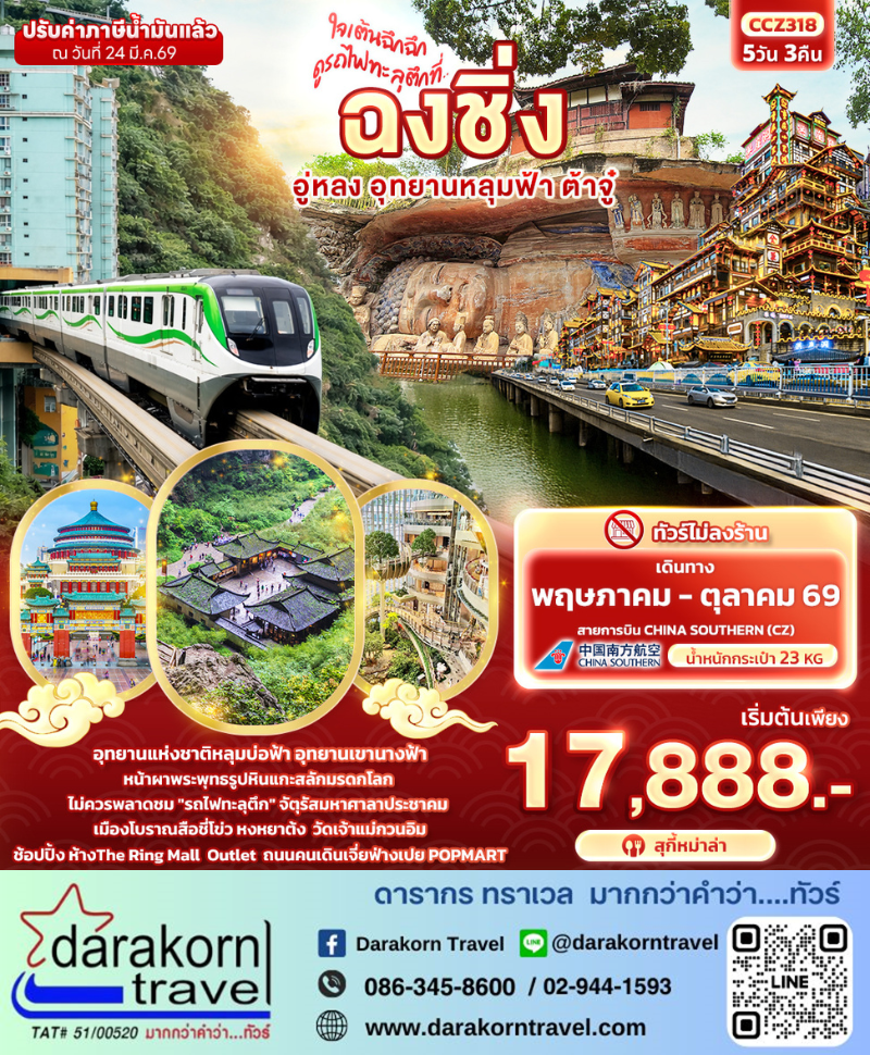 | DAY5 | วัดเจ้าแม่กวนอิม – Outlet Chongqing – ห้างThe Ring Mall of Hongkong Land’s – ถนนคนเดินเจี้ยฟ่างเปย+ร้านPOPMART – ท่าอากาศยานนานาชาติฉงชิ่งเจียงเป่ย์ – ท่าอากาศยานนานาชาติสุวรรณภูมิ |
