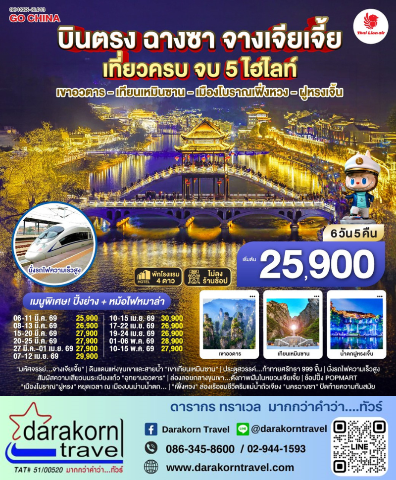 ทัวร์จีน - จางเจียเจี้ย เที่ยวครบ จบ 5 ไฮไลท์ 6วัน5คืน(SL)เดือนมีนาคม - พฤษภาคม 2569