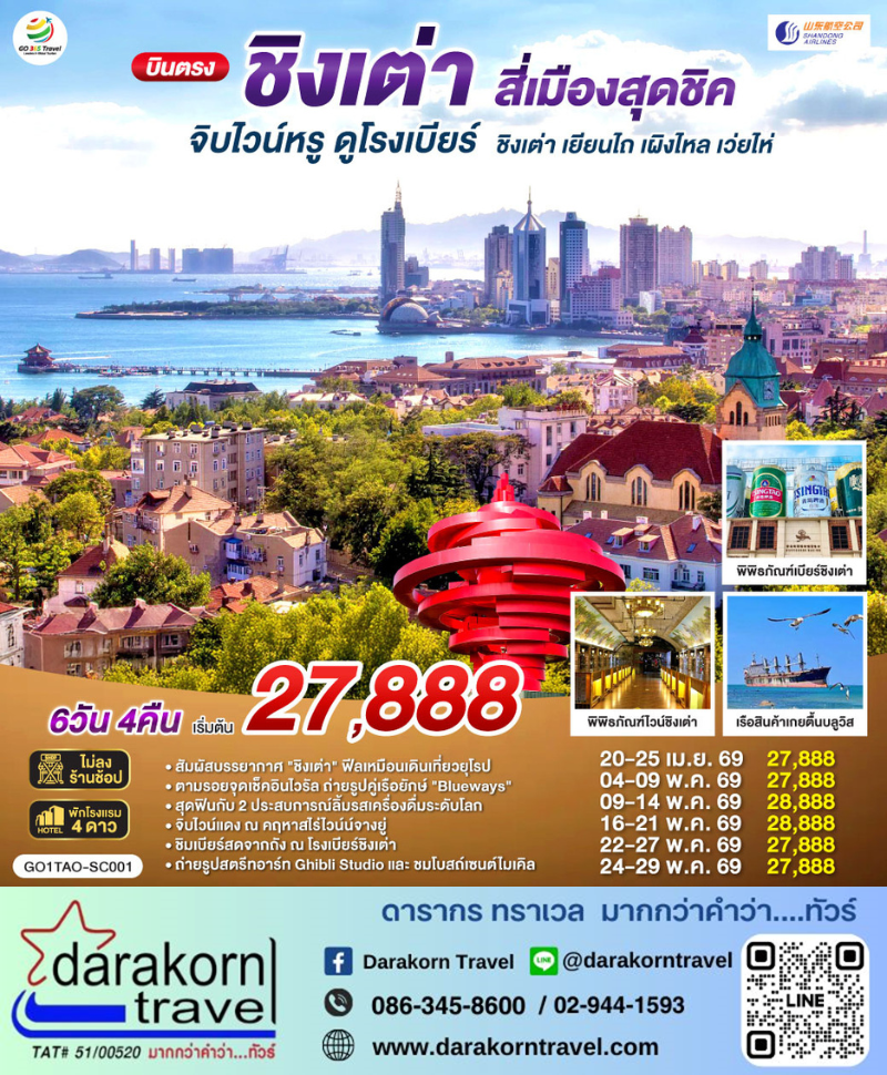 | DAY6 | ย่านปาต้ากวน – เขาซิ่นฮ่าวซาน – เช็คอินจัตุรัส 54 – ชิงเต่า (ท่าอากาศยานชิงเต่าเจียวตง) – กรุงเทพฯ (สนามบินสุวรรณภูมิ) |