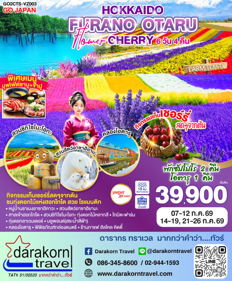 | DAY3 | ผ่านชมทุ่งหญ้าบิเอะ – สวนชิกิไซโนะโอกะ – ทุ่งดอกไม้หลากสี – บุฟเฟ่ต์เมล่อน – โทมิตะฟาร์ม – ทุ่งดอกลาเวนเดอร์ – บลูพอนด์(สระน้ำสีฟ้า) – เมืองโอตารุ – พิเศษเมนูบุฟเฟ่ต์ชาบู+ขาปู |