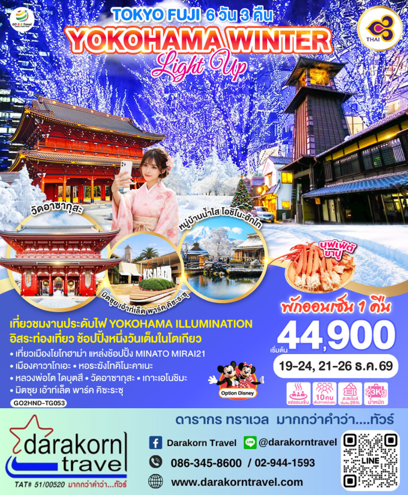 | DAY3 | มวิวฟูจิ ริมทะเลสาบคาวากุจิโกะ – กิจกรรม ชงชาญี่ปุ่น – เมืองฟูจิโนะมิยะ – วัดไทเซคิจิ – เมืองโยโกฮาม่า – แหล่งช้อปปิ้ง MINATO MIRAI21 – อิสระเที่ยวชมงานประดับไฟ YOKOHAMA ILLUMINATION |