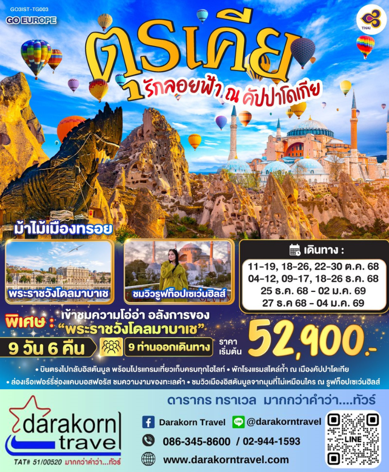 | DAY3 | อิสตันบลู- ฮิปโปโดรม – ฮาเกียโซเฟีย – เซเว่นฮิลล์ส – สุเหร่าสีน้ำเงิน – อ่างเก็บน้ำเยเรบาตัน – ชานัคคาเล่ – ม้าไม้แห่งทรอยนบอลลูนชมเมืองคัเคีย – จุดชมวิวเกอเรเม่ – หุบเขา |