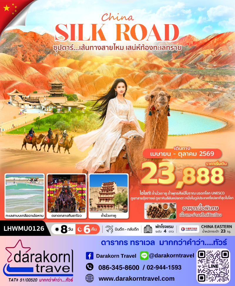 | DAY4 | ประติมากรรมทารกแห่งแผ่นดิน – ประติมากรรมพระพักตร์แห่งจักรพรรดิฮั่นอู่ตี้ – ทะเลทรายหมิงซาซาน และ สระน้ำพระจันทร์เสี้ยว (รวมค่าบัตรเข้า) – ตุนหวง – ตลาดกลางคืนซาโจว |