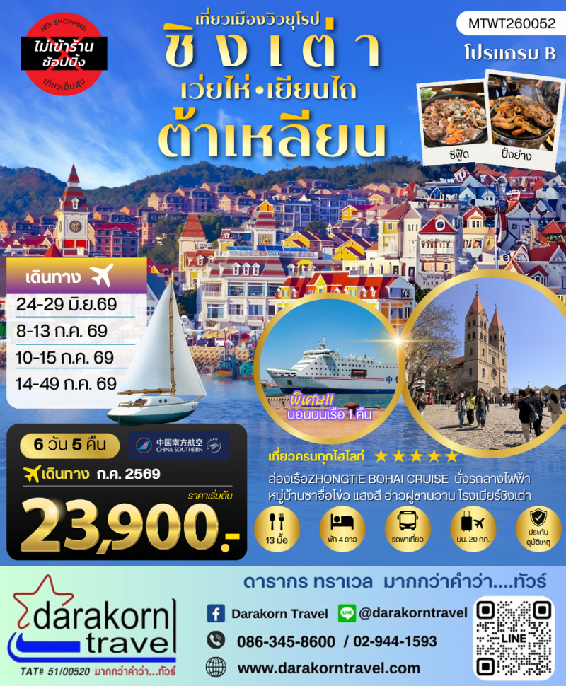 | DAY4 | เมืองเวยไห่-สวนสาธารณะเวยไห่-กรอบรูปยักษ์วิวทะเล-ถนนคบเพลิงเลขแปด-ประตูแห่งโชคลาภ-เผิงไหล-อุทยานแปดเซียนข้ามทะเล-เมืองเยียนไถ-ปลาวาฬเกยตื้น-ท่าเรือประมงไห่ชาง- ขึ้นเรือเพื่อเดินทางสู่เมืองต้าเหลียน (นอนค้างคืนบนเรือ) |