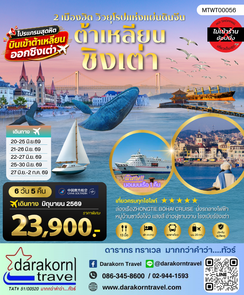 | DAY2 | เมืองต้าเหลียน–จัตุรัสซิงไห่-ย่านถนนตงกวน-ถนนญี่ปุ่น-เวนิสตะวันออก-ถนนรัสเซีย-เดินทางโดย เรือท่องเที่ยวสู่เมืองชิงเต่า (พักค้างคืนบนเรือ) |