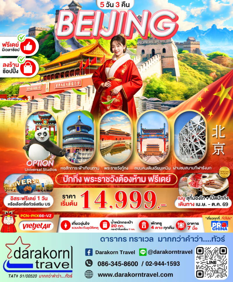 ทัวร์จีน - ปักกิ่ง กำแพงเมืองจีน ฟรีเดย์ (ทัวร์ลงร้าน) 5วัน3คืน(VZ)เดือนพฤษภาคม - ตุลาคม 2569