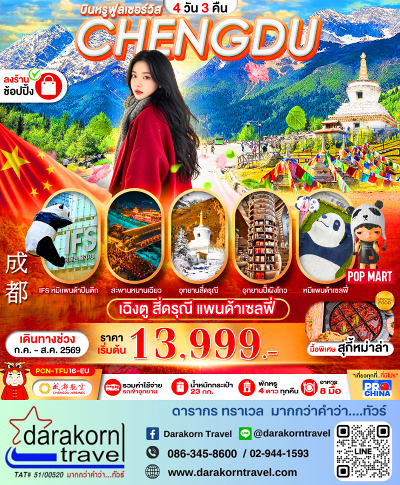 | DAY1 | ท่าอากาศยานนานาชาติสุวรรณภูมิ – ท่าอากาศยานนานาชาติเฉิงตูเทียนฟู่ (เมืองเฉิงตู) |