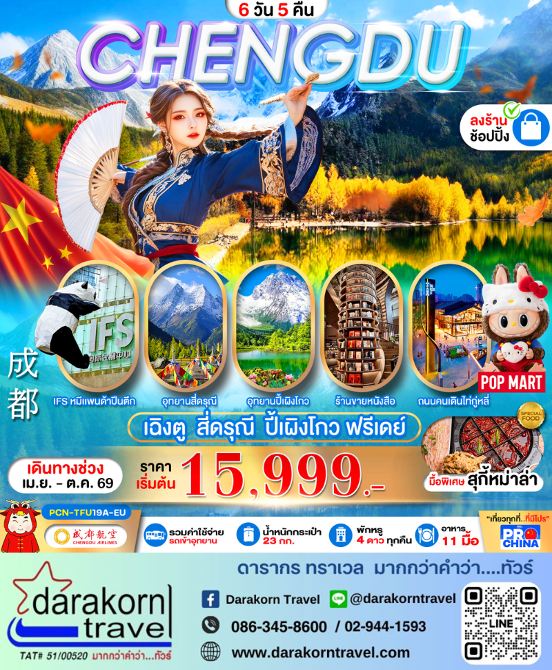 | DAY6 | ร้านหยก – ร้านผ้าไหม – ถนนโบราณจิ๋นหลี่ – เข้าสนามบิน-ท่าอากาศยานนานาชาติเฉิงตูเทียนฟู่ – ท่าอากาศยานนานาชาติสุวรรณภูมิ(EU2867 : 18.20 – 20.30) |