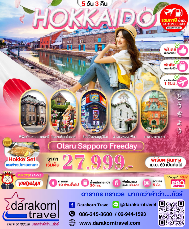 | DAY2 | สนามบินเถาหยวน-สนามบินชิโทเซ่ ฮอกไกโด-เมืองท่าโอตารุ คลองโอตารุ-พิพิธภัณฑ์กล่องดนตรี-ศาลเจ้า ฮอกไกโด-ศาลาว่าการของฮอกไกโด-ผ่านชมหอนาฬิกา-ช้อปปิ้งย่านทานุกิโคจิ |
