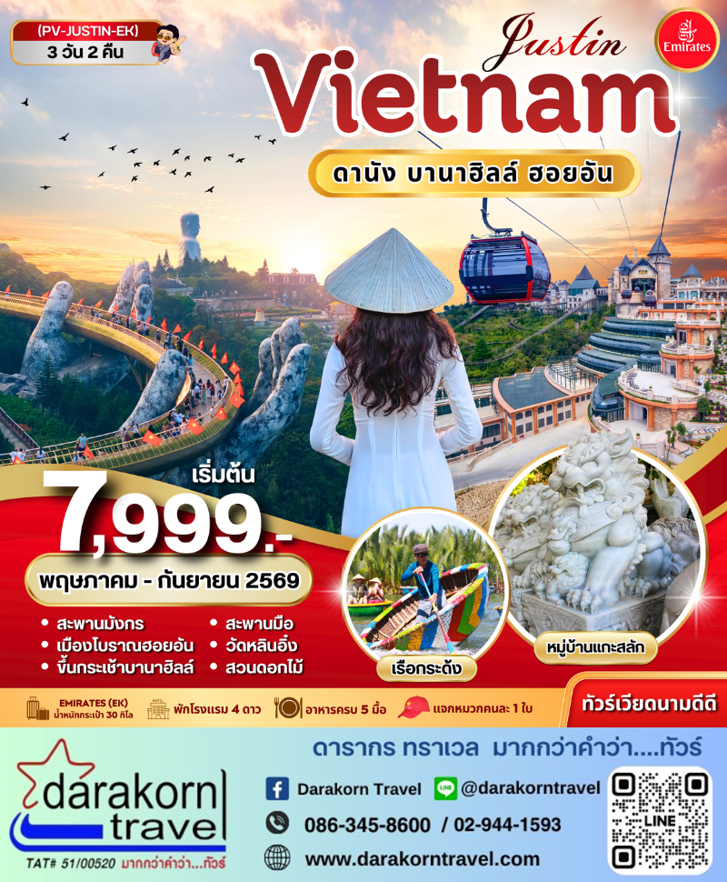 | DAY3 | ร้านเยื่อไผ่ – เมืองโบราณ ฮอยอัน – ล่องเรือกระด้ง – หมู่บ้านแกะสลักหินอ่อน – ร้านผ้าไหม – สะพานมังกร – สนามบินดานัง |