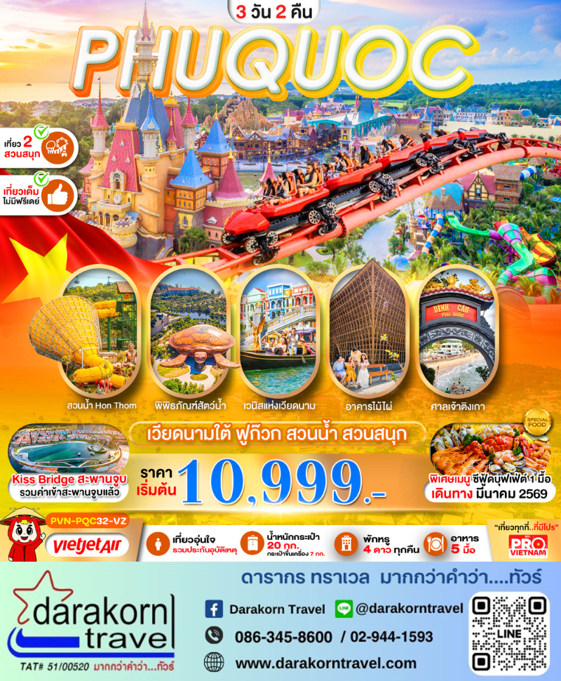 | DAY1 | สนามบินสุวรรณภูมิ – สนามบินฟูก๊วก นั่งกระเช้าข้ามทะเลเกาะHon Thom – สวนสนุก สวนน้ำ ชายหาดHon Thom – สะพานจูบ |