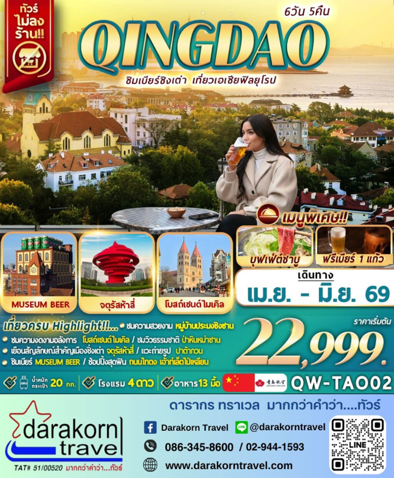 | DAY1 | สนามบินนานาชาติสุวรรณภูมิ (กรุงเทพฯ) QW918 (BKK – TAO 18.10 น.-23.55 น.) – ท่าอากาศยานนานาชาติชิงเต่าเจียวตง |