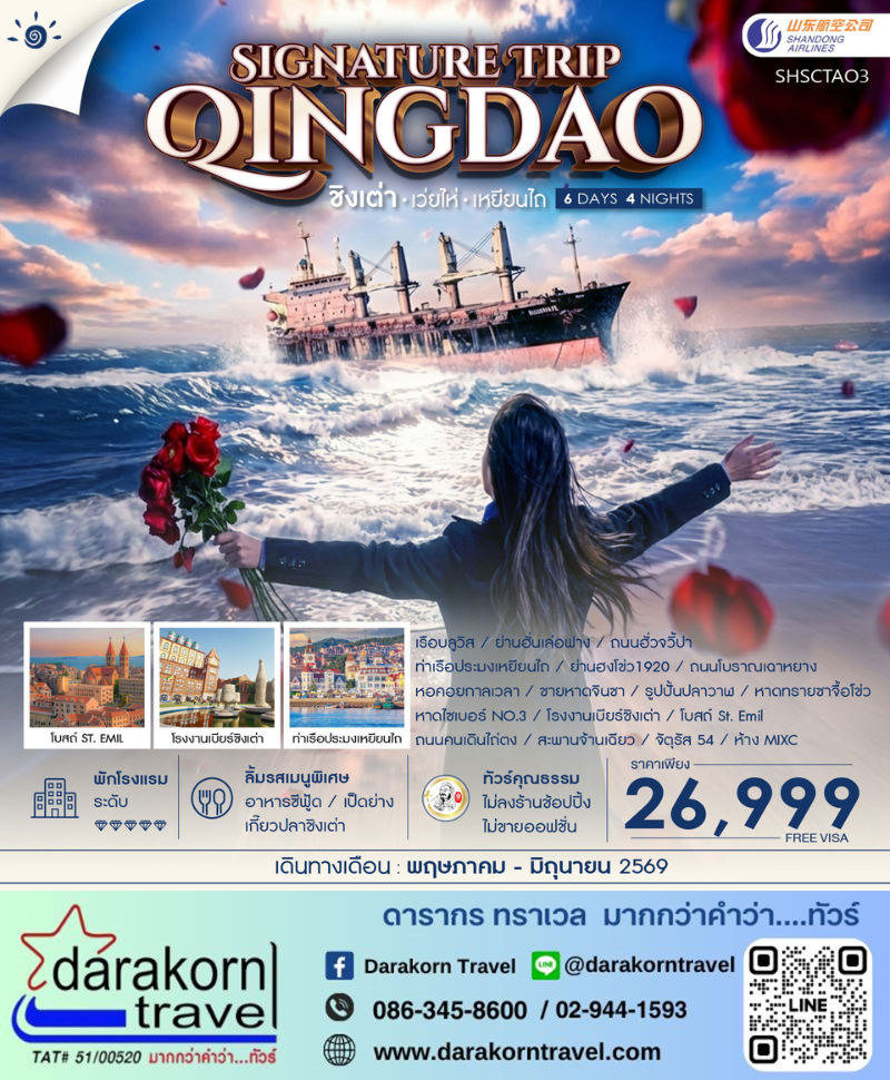 ทัวร์จีน - Qingdao Signature Trip ชิงเต่า เว่ยไห่ เหยียนไถ 6วัน4คืน(SC)เดือนพฤษภาคม - ตุลาคม 2569