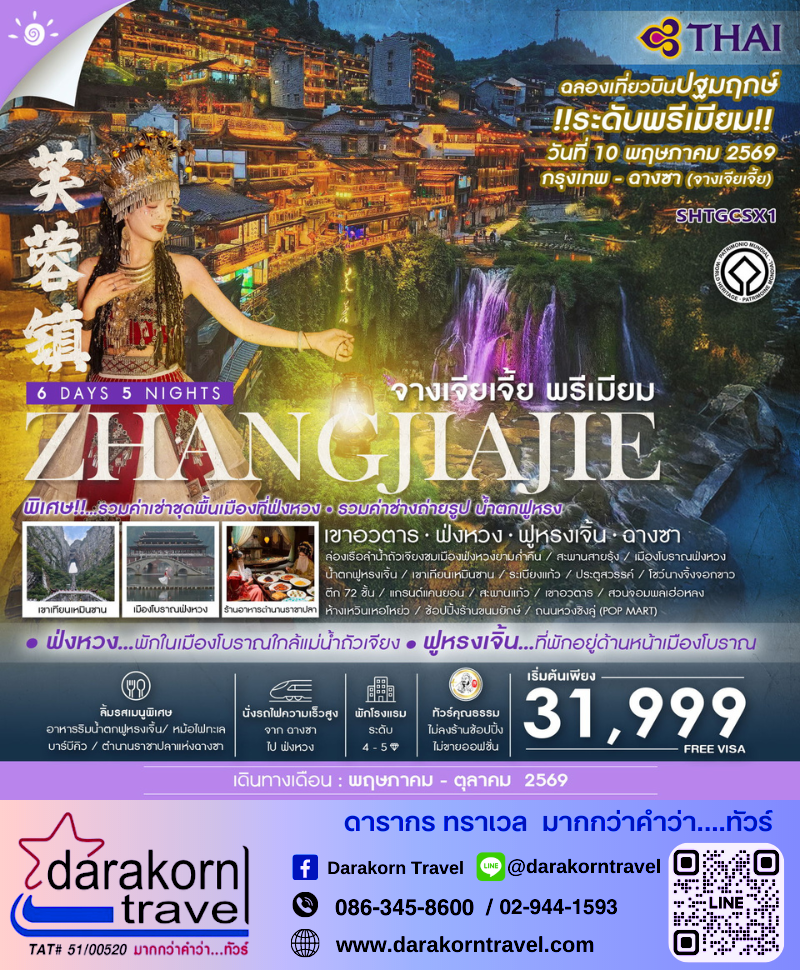 ทัวร์จีน - จางเจียเจี้ย พรีเมียม เขาอวตาร ฟ่งหวง ฟูหรงเจิ้น ฉางซา 6วัน5คืน(TG)เดือนพฤษภาคม - ตุลาคม 2569