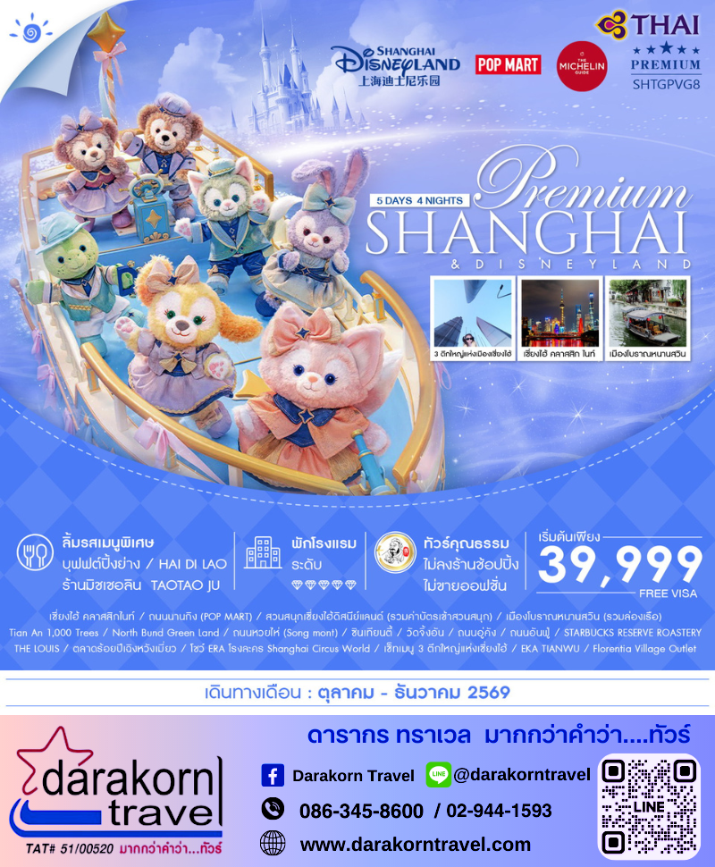 ทัวร์จีน - เซี่ยงไฮ้ พรีเมี่ยม ดิสนีย์แลนด์ เมืองโบราณหนานสวิน 5วัน4คืน(TG)เดือนตุลาคม - ธันวาคม 2569