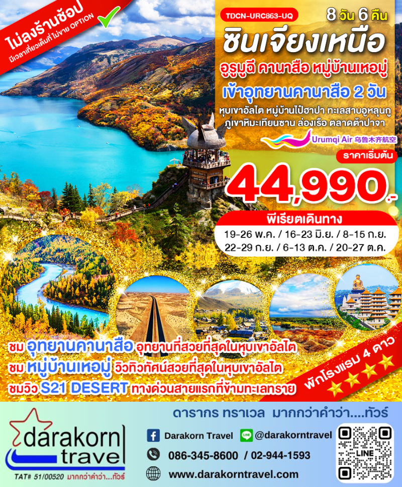 | ทัวร์จีน – ซินเจียงเหนือ อูรูมูฉี คานาสือ หมู่บ้านเหอมู่ หุบเขาอัลไต หมู่บ้านไป๋ฮาปา ทะเลสาบอูหลุนกู ภูเขาหิมะเทียนซาน 8วัน6คืน(UQ)เดือนพฤษภาคม – ตุลาคม 2569 |