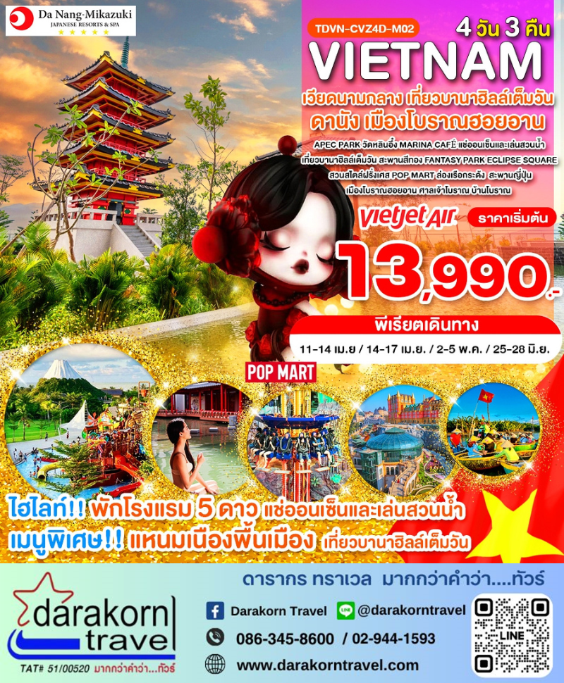 | DAY1 | ท่าอากาศยานสุวรรณภูมิ – สนามบินดานัง – APEC PARK – วัดหลินอึ๋ง – Café Son Tra Marina – MIKAZUKI JAPANESE RESORTA&SPA – อิสระแช่ออนเซ็น – อิสระเล่นสวนน้ำ (แช่ออนเซ็น – เล่นสวนน้ำ รวมในค่าทัวร์แล้ว) |