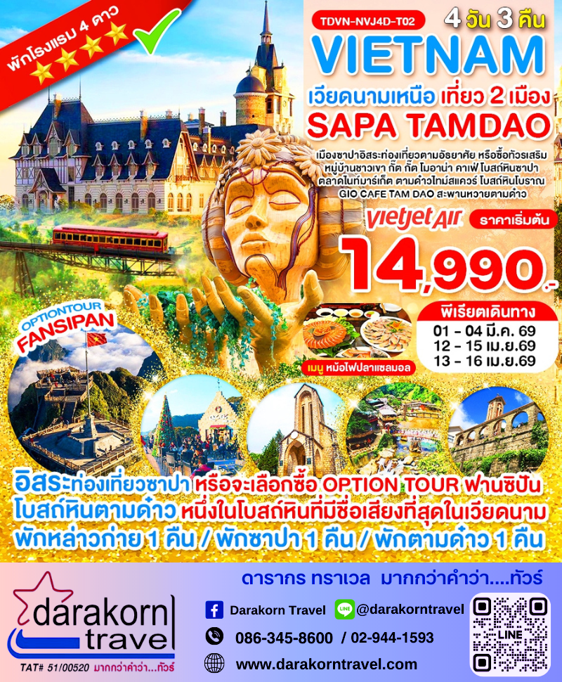 | DAY2 | เมืองหล่าวก่าย – เมืองซาปา – อิสระท่องเที่ยวเมืองซาปาหรือจะเลือกซื้อ OPTION TOUR (ฟานซีปัน) – หมู่บ้าน ชาวเขา ก๊ัต ก๊ัต – โมอาน่า ซาปา คาเฟ่ – โบสถ์หินซาปา –ไนท์มาร์เก็ต – พักซาปา |