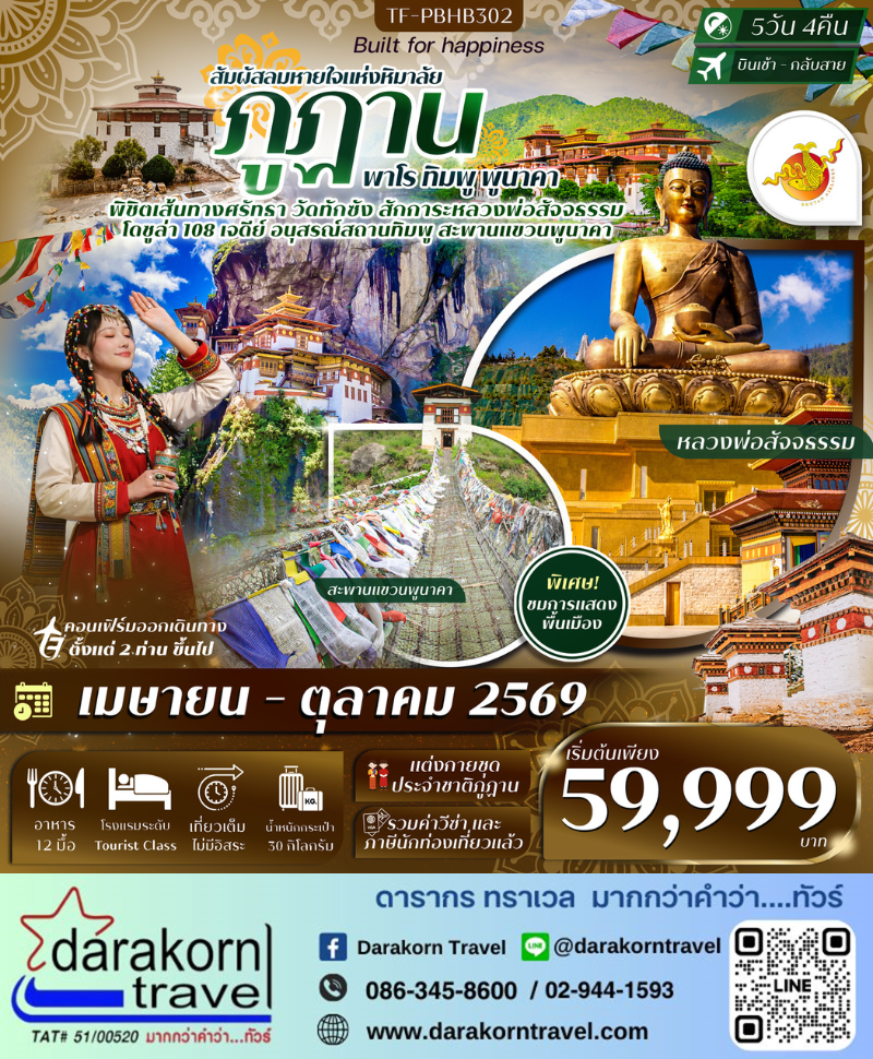ทัวร์ภูฏาน - ภูฎาน เที่ยวครบ วัดทักซัง พาโร ทิมพู พูนาคา 5วัน4คืน(B3)เดือนเมษายน - ตุลาคม 2569