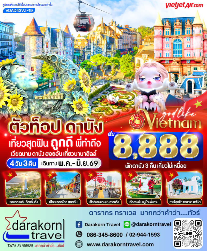 | DAY1 | ท่าอากาศยานสุวรรณภูมิ– ท่าอากาศยานเมืองดานัง (ประเทศเวียดนาม) – เมืองดานัง – สักการะเจ้าแม่กวนอิมวัดหลิ๋นอึ๋ง – ร้านคาเฟ่ Son Tra Marina Café (ไม่รวมเครื่องดื่ม) – ร้านกาแฟ Palm Beach – หาดหมีเคว (My Khe Beach) |
