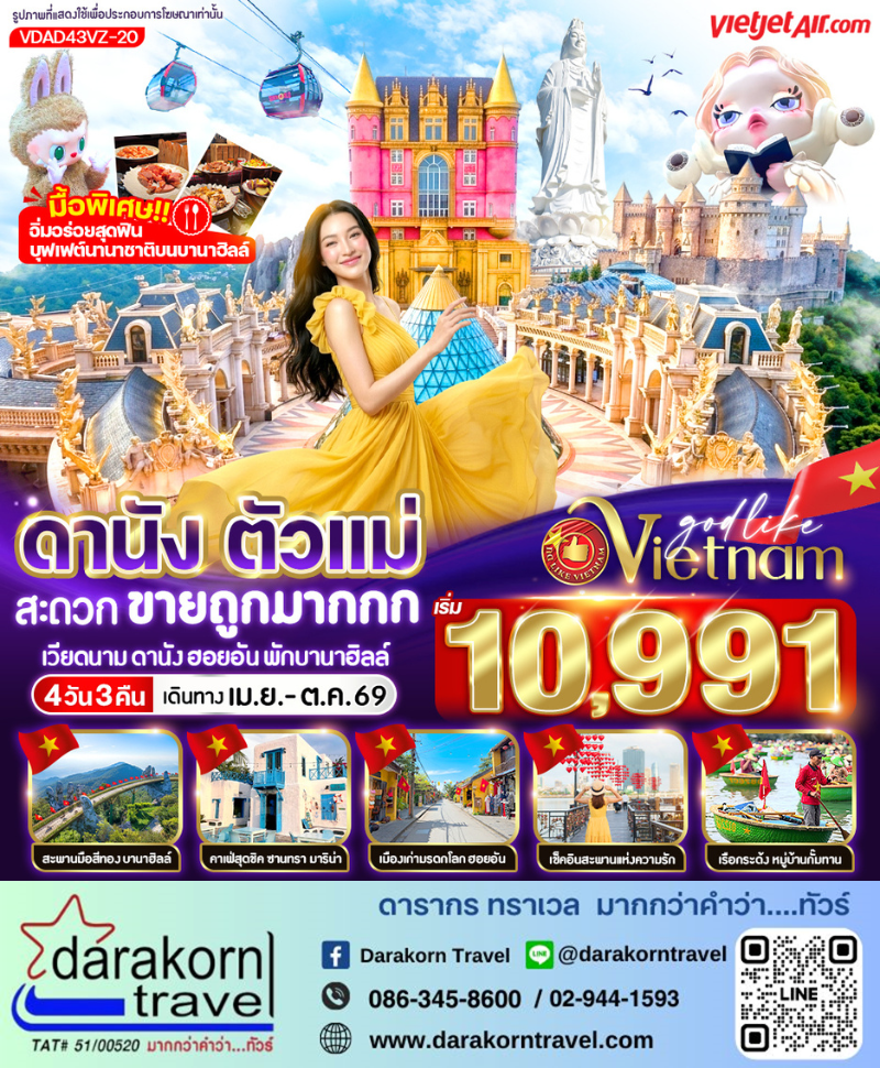 | DAY1 | สนามบินสุวรรณภูมิ – สนามบินดานัง – นั่งกระเช้าไฟฟ้าขึ้นสู่บานาฮิลล์ (หมู่บ้านฝรั่งเศส – สะพานมือทองคำ – สวนดอกไม้ – สวนสนุกFantasy Park) |