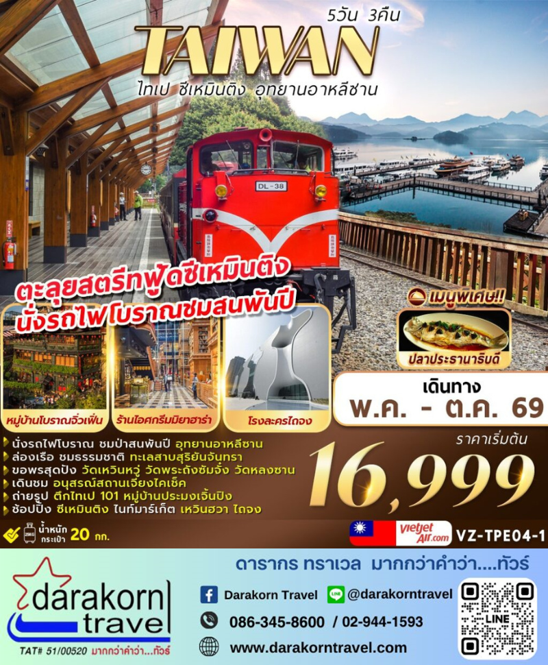 ทัวร์ไต้หวัน - TAIWAN ไทเป ซีเหมินติง อุทยานอาหลีซาน 5วัน3คืน(VZ)เดือนพฤษภาคม - ตุลาคม 2569