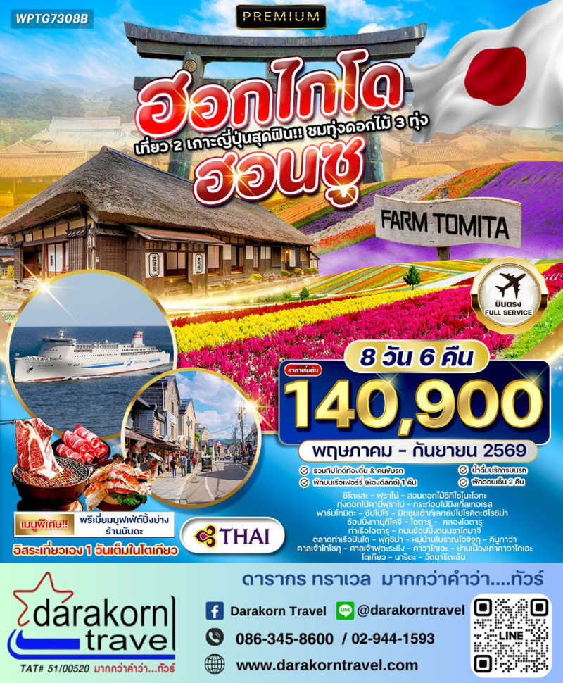 ทัวร์ญี่ปุ่น - ฮอกไกโด ฮอนชู 8วัน6คืน(TG)เดือนพฤษภาคม - กันยายน 2569