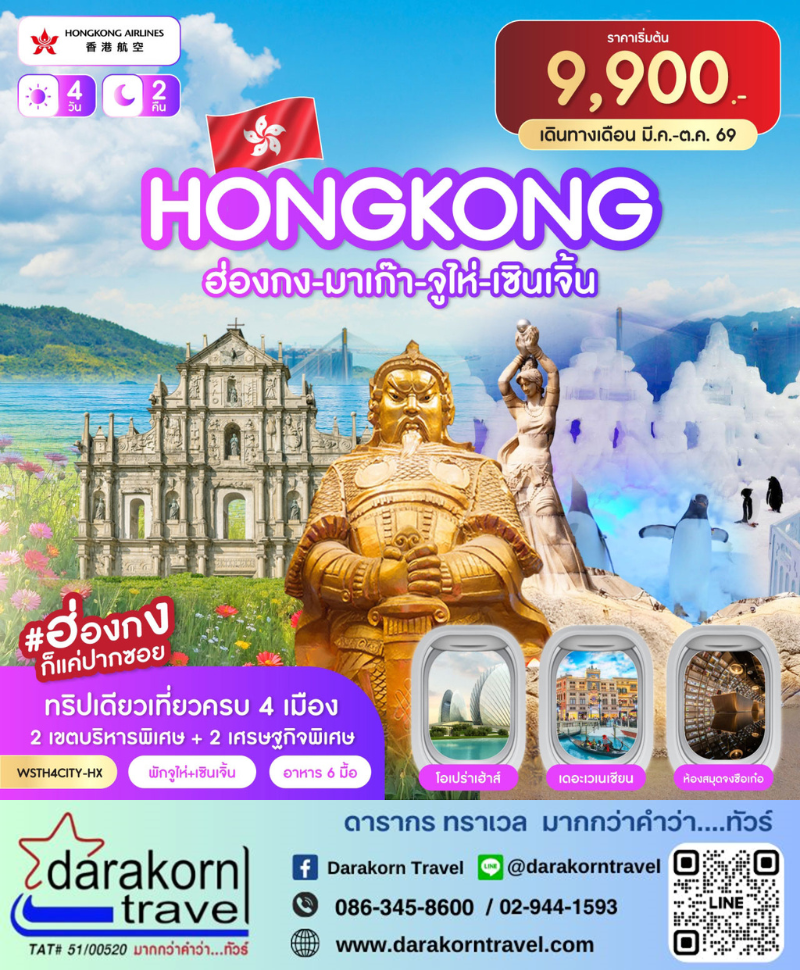ทัวร์ฮ่องกง - ฮ่องกง-มาเก๊า-จูไห่-เซินเจิ้น 4วัน2คืน(HX)เดือนเมษายน - ตุลาคม 2569