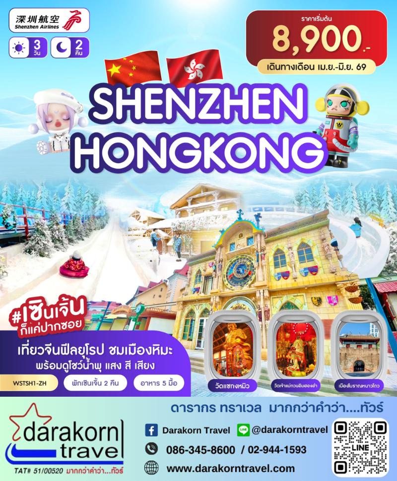 | DAY1 | รุงเทพฯ-เซินเจิ้น-BKK-SZX ZH306 0315-0700-วัดกวนอู-เมืองยุโรปมาเลเนีย-เมืองหิมะ (Snow Town)-ถนนคนเดินตงเหมิน-Oh Bay-ดูโชว์น้ำพุ หรือ Co Co Park |