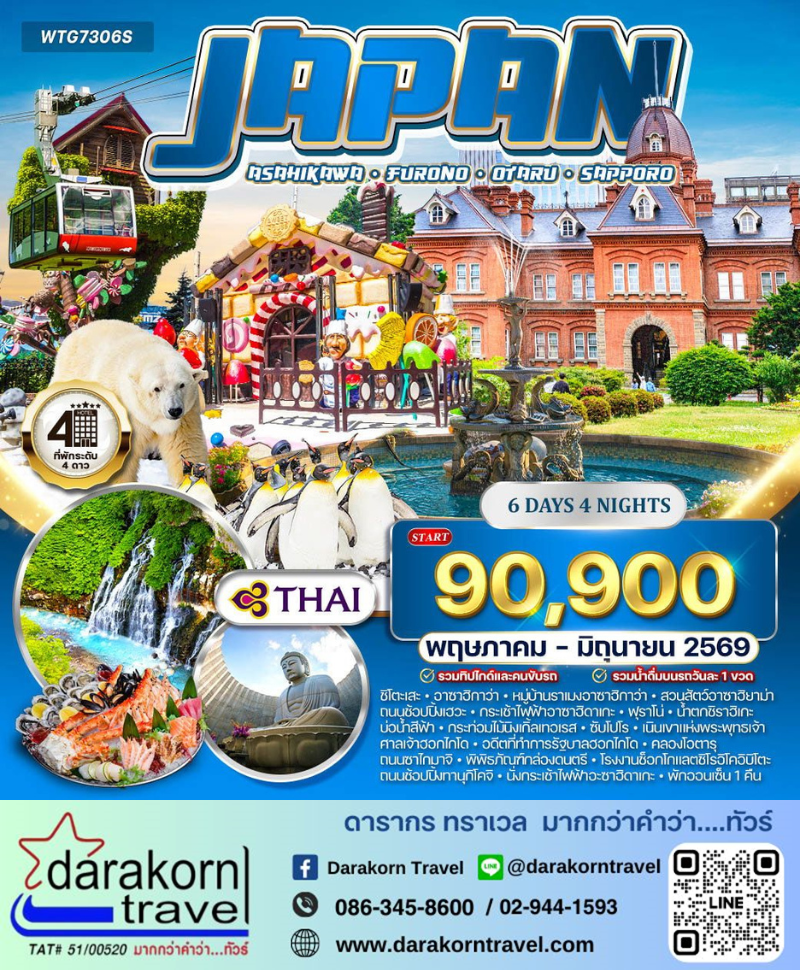 | DAY1 | กรุงเทพฯ (สนามบินสุวรรณภูมิ) – ซัปโปโร (สนามบินชิโตเซะ) (TG670 : 23.45-08.30) |