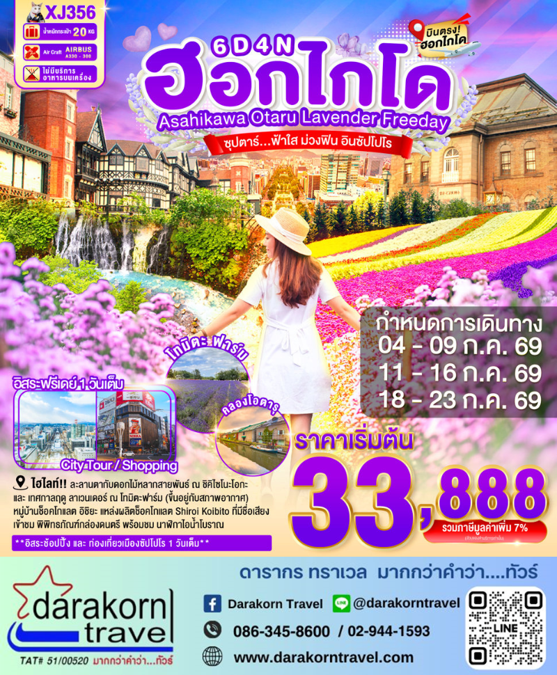 | DAY3 | เมืองฟุราโนะ – ฟาร์มโทมิตะ – ชมดอกไม้ ณ สวนชิคิไซโนะโอกะ – ซัปโปโร – ศาลาว่าการเมืองฮอกไกโดหลังเก่า – หอนาฬิกาเมืองซัปโปโร (ผ่านชม) – ย่านซูซูกิโนะ |