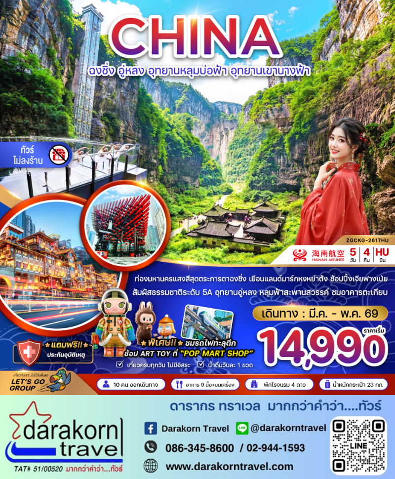 | DAY1 | สนามบินสุวรรณภูมิ – สนามบินฉงชิ่งเจียงเป่ย์ – เมืองฉงชิ่ง –ถนนคนเดินหลงเหมินฮาว |