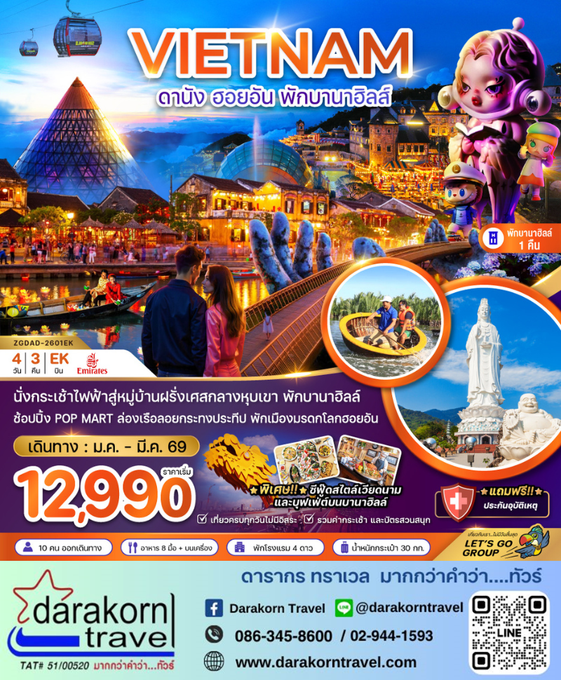 | DAY1 | กรุงเทพฯ (ท่าอากาศยานสุวรรณภูมิ) – ดานัง(ท่าอากาศยานนานาชาติดานัง) EK370 : 20:10 – 21:50) – เมืองดานัง |