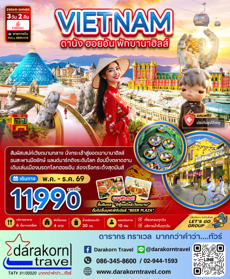 ทัวร์เวียดนาม - เวียดนามกลาง ดานัง ฮอยอัน พักบานาฮิลล์ 1 คืน 3วัน2คืน(EK)เดือนพฤษภาคม - ธันวาคม 2569
